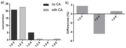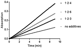 在该论文中,药学院陈敬华团队采用动态组合化学策略,以碳酸酐酶为靶点,建立了含有不同功能基团的两个动态聚合物库,由酶进行自主筛选,从而“定制”酶催化最优微环境,并对其筛选机理做了初步探讨(图1)。基于对聚合物库组分的实时监测,酶的加入可明显调控各组分分布,例如,可抑制聚合物库II中1·2·4的合成(图2),进一步酶活化测试表明,聚合物1·2·4增强酶催化活性效果最为显著(图3)。这一现象可归结于该组分在酶表面结合能力最强,从而参与聚合程度最低。因此,该论文成功建立了酶自主优化微环境的动态筛选模型,对个性化“定制”其他酶催化微环境、提高其稳定性和活性具有重要指导意义。