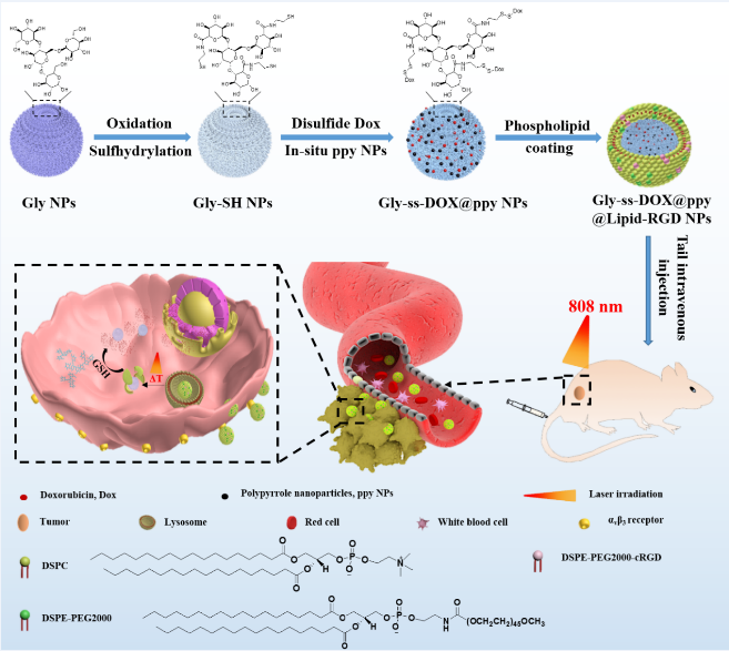 在以上工作基础上该团队建立了基于糖原纳米粒子的化疗-热疗肿瘤联合治疗系统。该系统通过二硫键嫁接抗肿瘤药物阿霉素,同时原位聚合具有良好生物相容性及良好光热效应的聚吡咯纳米粒子,最后所得体系被自组装的磷脂层包裹。该磷脂层可以有效保护纳米粒子免受蛋白吸附,同时磷脂层中的RGD配体与肿瘤血管内皮细胞表面高度表达的αvβ3特异结合,进而带领粒子穿透肿瘤组织并靶向肿瘤细胞。在癌细胞中高浓度的谷胱甘肽还原作用下,糖原粒子表面的二硫键被切断并释放药物,引起细胞凋亡。同时,聚吡咯纳米粒子经近红外光照射导致温度升高,促进肿瘤细胞的死亡。研究成果发表于《ACS Applied Materials & Interfaces》,周娟副研究员为论文第一作者,陈敬华教授为通讯作者。